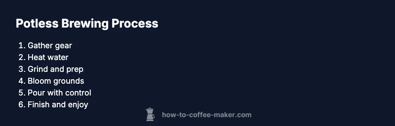 Learn practical potless brewing methods for coffee without a traditional pot. Step-by-step guides, gear lists, safety tips, and cleanup advice to enjoy strong, flavorful coffee directly in your cup.