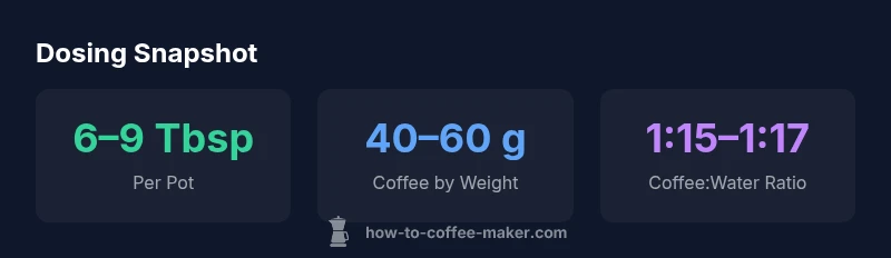 A typical starting point is 6–9 tablespoons (about 40–60 grams) for the full pot, adjusted to taste. If you measure by weight, aim for a 1:15–1:17 coffee-to-water ratio based on your cup size.