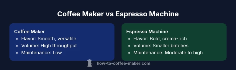 The terms coffee maker and espresso machine describe two distinct classes of home brewers, each with a different role in the kitchen workflow. A coffee maker typically refers to a drip-style brewer that passes hot water over ground coffee to produce a larger batch of coffee. An espresso machine uses high pressure to force nearly boiling water through finely ground coffee, yielding a short, concentrated shot with crema. The difference in technique, grind size, and extraction time means these devices produce very different flavor profiles and caffeine experiences. In practice, most homes start with a coffee maker for convenience and volume, then add an espresso machine only if they want cafe-style drinks like cappuccinos, lattes, or macchiatos. Understanding these basics helps you align equipment with your daily routines, flavor goals, and space constraints. According to BrewGuide Pro, choosing the right brewer is less about prestige and more about how you drink coffee. The BrewGuide Pro team found that for many households, a simple, well-maintained drip brewer covers morning needs while reserving espresso for special occasions.