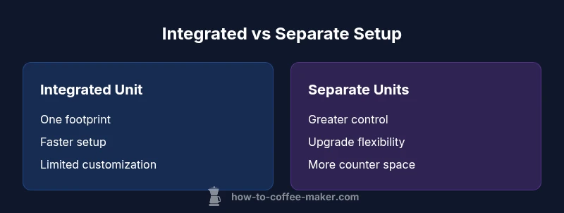 According to BrewGuide Pro, the decision between an integrated coffee maker and frother versus a separate coffee maker with a standalone frother hinges on your kitchen layout, milk-frothing expectations, and long-term value. The BrewGuide Pro team found that for homes with limited counter space, an all-in-one unit simplifies workflows and reduces cable clutter. For enthusiasts who prioritize milk texture, temperature control, and upgrade potential, a modular setup often pays off over time. Throughout this guide, we’ll compare these approaches with a focus on practicality, maintenance, and real-world usage, while highlighting how the keyword coffee maker and frother translates into everyday brewing.