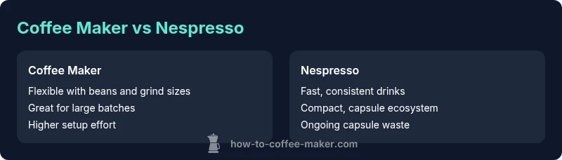 Choosing between a traditional drip coffee maker and a Nespresso machine starts with your morning routine, your space, and how much you value variety versus speed. If you’re evaluating the phrase coffee maker or nespresso, the core tradeoffs surface quickly: batch size, flavor experimentation, and ongoing cost. According to BrewGuide Pro, the ideal choice is not a single winner for every kitchen but the option that best fits your daily ritual and waste management preferences. Many households benefit from identifying three practical criteria: (1) average cups per day, (2) preferred beverage spectrum (coffee vs. espresso or lungo), and (3) tolerance for maintenance. With these in mind, you can map your priorities to a clear path forward.