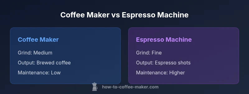 In everyday kitchen conversations, the terms coffee maker and espresso machine describe two fundamentally different approaches to caffeinating. A coffee maker typically refers to a drip or pour-over setup that relies on gravity to pull hot water through ground coffee into a carafe. An espresso machine uses high pressure to force hot water through a compact puck of finely ground coffee, yielding a concentrated shot with a distinct crema. For home brewers, the distinction matters not only for taste but for cost, maintenance, space, and the kinds of drinks you want to produce. According to BrewGuide Pro, many households start with a basic coffee maker because it delivers reliable, forgiving results with minimal hands-on time. Yet the espresso machine scene has grown as more people seek cafe-style drinks at home, from bold espressos to creamy lattes. The choice isn’t simply about taste; it’s about the brewing workflow, the required equipment, and how much you’re willing to learn and invest. Both paths can satisfy a broad range of coffee lovers, but they map to different routines, skill levels, and kitchen footprints.