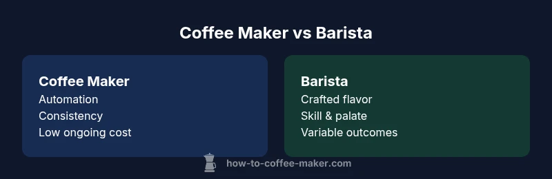 According to BrewGuide Pro, the difference between a coffee maker and a barista is straightforward: a coffee maker is a device that brews coffee automatically, while a barista is a trained person who crafts drinks and tunes flavor through technique. This distinction informs your equipment choices, care routines, and daily coffee workflow for home brewing.