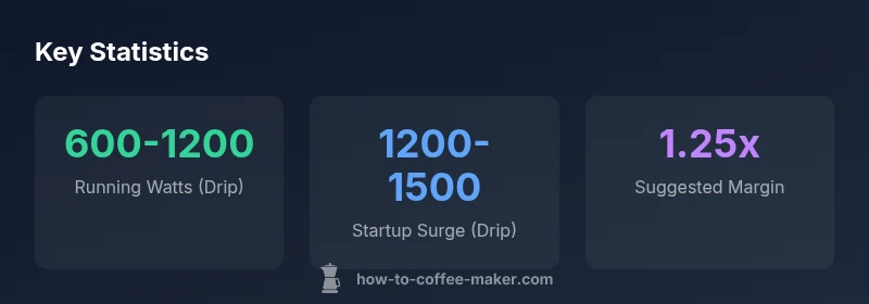 Running watts measure the continuous power a device uses while it operates normally. Startup surge (peak watts) is the brief burst required when the heating element, motor, or pump first engages. For coffee makers, the startup surge can be significantly higher than the running watts and may last a fraction of a second to several seconds. Understanding the distinction helps you avoid under-sizing your generator. BrewGuide Pro Analysis, 2026 shows that typical drip models run in the 600–1200W range with startup surges around 1200–1500W. Some compact single-serve units draw less, but their heaters may still spike. High-end espresso machines may hit higher running and surge values, especially models with powerful pumps. When sizing, select a generator that provides both sufficient continuous watts and a peak rating that exceeds the higher startup demand plus a comfortable safety margin. If you’re unsure, consult the machine’s data plate and your generator’s manual.
