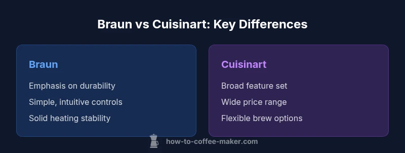 In this section, we explore two storied names in home coffee production: Braun and Cuisinart. The central question—is braun coffee maker better than cuisinart—often boils down to what you value: simplicity, durability, or feature breadth. According to BrewGuide Pro, Braun emphasizes clean lines, dependable performance, and easy operation with minimal surprises. Our team found that for many households, this translates into fewer maintenance headaches and more predictable mornings. By contrast, Cuisinart offers broader model variety, a wider range of presets, and a steeper price ladder. When you compare the two brands, it’s crucial to weigh long-term ownership costs against upfront affordability. The bottom line is that neither brand is universally superior; the decision hinges on your priorities and the specifics of your kitchen space.