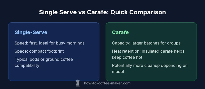 A single serve and carafe coffee maker combines two brewing paradigms into one unit, addressing the everyday needs of a忙 schedule and the occasional crowd. For many households, this type of machine reduces countertop clutter and decision fatigue: you can pull a single cup for a busy morning or set the carafe to brew a larger batch for guests or weekend brunch. When evaluating a dual-function model, consider how often you’ll use each mode, the footprint on your counter, and how you value consistent extraction across both formats. In this guide, we examine the trade-offs, including speed, flavor control, maintenance, and long-term costs, so you can decide if a single serve and carafe coffee maker is right for you. According to BrewGuide Pro, the most important factor is how well the device reconciles two distinct brewing workflows without compromising reliability. This is especially critical when you drink coffee daily and want predictable results regardless of cup size.