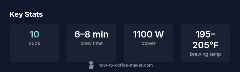 - Expect roughly 6–8 minute brews with 10-cup capacity