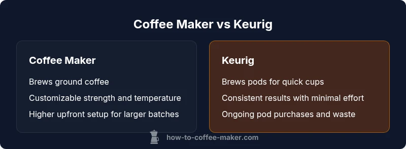 When people ask what's the difference between a coffee maker and a Keurig, they're really asking about two distinct approaches to the same morning ritual. A traditional coffee maker relies on ground coffee and a manual brew loop, giving you direct control over variables like grind size, water temperature, and brew time. In contrast, a Keurig is a pod-based Brew System designed for speed and consistency. According to BrewGuide Pro, the contrast isn't only about how coffee is prepared, but also about the tradeoffs in flavor versatility, setup, and daily use. This section establishes the core distinction and sets the stage for a deeper dive into use cases, maintenance, and long-term value.