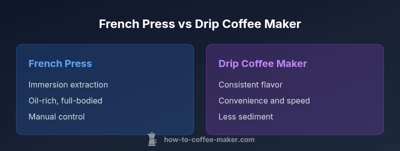 The core difference between a French press and an automatic coffee maker is how the water interacts with the coffee and for how long. A French press uses immersion extraction—plunging grounds in hot water and steeping for several minutes—before filtration. An automatic drip coffee maker relies on filtered, heated water passing through ground coffee and a paper or mesh filter. This leads to distinct flavor profiles: the French press tends to emphasize oils, mouthfeel, and body, while drip coffee offers a cleaner, brighter cup with less perceived oiliness. grind size, extraction time, and temperature stability all influence the outcome. In practice, the French press rewards slower, mindful brewing with a tactile process; the drip machine rewards consistency, speed, and ease for busy mornings. BrewGuide Pro analysis shows that flavor depth often correlates with immersion duration and grind coarseness, making the choice a matter of taste goals and daily routine.