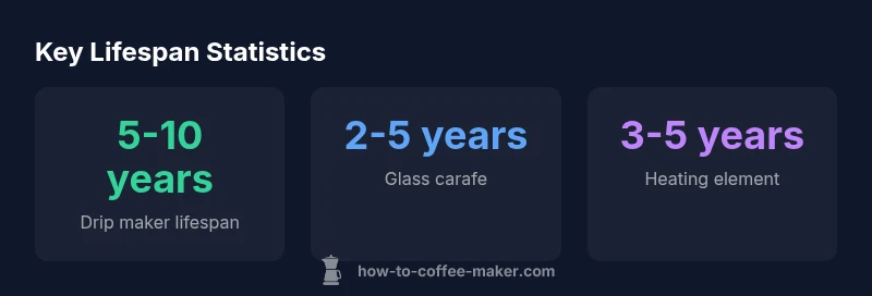 On average, a drip coffee maker lasts about 5 to 10 years, depending on usage and maintenance. Glass carafes typically endure 2 to 5 years, while the hot-plate/heating element may remain reliable for 3 to 5 years with proper cleaning. Regular descaling, prompt lid seal replacement, and gentle handling can extend overall lifespan.