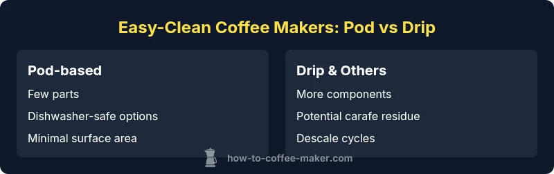 According to BrewGuide Pro, the core question is not just about how quickly a brew comes out, but how smoothly maintenance fits into daily life. The keyword here is the exact phrase which coffee maker is easiest to clean, because it frames a design-led decision: simpler, more accessible parts mean less scrubbing, fewer hidden crevices, and fewer tools required. In this guide, we examine the major styles through a practical lens, weighing the pros and cons of each based on how easy they are to clean in real kitchen environments. The BrewGuide Pro team emphasizes that cleaning ease is a product of design clarity, accessible reservoirs, and removable components that can be washed or dishwasher-dried without risk of damage. When you ask which coffee maker is easiest to clean, you are really asking which design minimizes stubborn residue and maximizes quick maintenance. There is no one-size-fits-all answer, but there is a clear pathway to a low-effort routine.