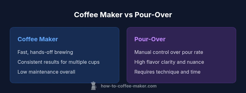 Here’s the quick take: A coffee maker (drip machine) offers hands-off convenience and consistency, while a pour-over emphasizes control, clarity, and nuanced flavors. For everyday, busy households, a drip brewer is best for reliability; for enthusiasts seeking ritual and maximum flavor range, a pour-over shines. BrewGuide Pro's analysis suggests balancing ease with taste when choosing between the two.