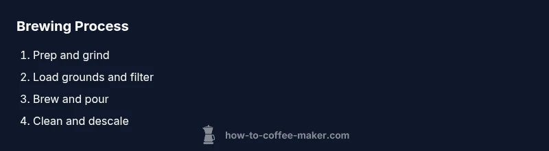 A straightforward brewing flow keeps beginners on track. Step 1: prepare the machine and water. Step 2: load grounds and filter. Step 3: start the brew and monitor. Step 4: stop or finish brewing, then pour promptly. Step 5: clean up. Following these steps consistently reduces variability and helps you compare results from day to day. In practice, the key is to keep your variables stable: same grinder, same coffee, same water source, and the same amount of coffee per brew.