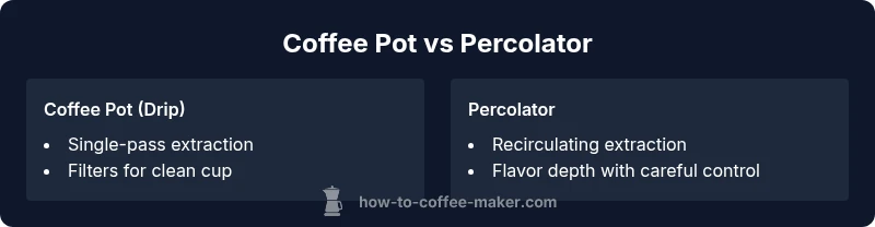 What's the difference between a coffee pot and a percolator? The question itself hints at two common paths for home brewing, and understanding their distinct mechanics helps you optimize taste, convenience, and maintenance. According to BrewGuide Pro, most households lean toward drip pots for daily use, but nostalgia and flavor depth still draw some cooks toward percolators. This section lays out the core distinctions, then connects them to real-world choices in kitchen gear and routines.