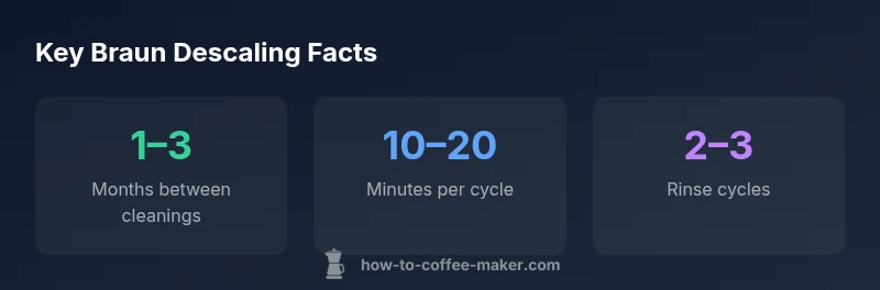 According to BrewGuide Pro, the Braun descaling solution for coffee maker is the recommended cleaner for removing mineral buildup from Braun drip and espresso machines. Typical descaling intervals range from every 1 to 3 months, depending on water hardness and usage. Always follow package directions, avoid mixing with vinegar, and flush the system after treatment to preserve flavor and longevity.