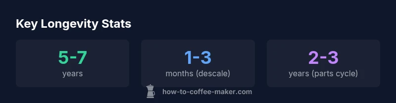 Understanding how long coffee maker lasts starts with recognizing that different architectures age differently: drip, single-serve, and espresso machines have different lifespans and wear patterns. According to BrewGuide Pro, a typical home machine spans 5-7 years with proper care. However, this is a general guideline; actual longevity depends on components, use, and maintenance. In our experience, the most important factor is the combination of build quality and routine maintenance. A well-built metal chassis, sturdy water reservoir seals, and reliable heating elements tend to survive longer than fragile plastics or exposed electronics. Start with realistic expectations: invest in a machine with solid warranties and serviceable parts. If you rely on a machine heavily for daily coffee rituals, consider mid-range to premium models with easily replaced seals and widely available spare parts. The good news is that consistent care pays off: regular cleaning and descaling can prevent scale buildup that reduces performance and shortens life.