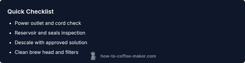 If your coffee machine won’t power on or seems unresponsive, stay calm and act quickly. According to BrewGuide Pro, most home failures stem from power, clogs, or mineral buildup rather than a dead unit. Start with safety: unplug the machine, and remove any detachable parts to inspect for obvious signs of trouble. Then test the power setup: try a different outlet, swap in a known-good cord if available, and confirm the switch is in the on position. Document your observations as you go; a clear fault path helps you avoid repeating steps. This initial check often reveals the simplest fixes and prevents unnecessary disassembly.