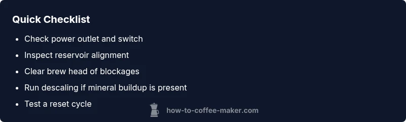 Most coffee makers that quit working are stopped by simple issues. Start by verifying power: is the outlet live and is the machine's power switch on? Then check the water reservoir, carafe, and brew head for clogs or misalignment. If the issue isn’t obvious, follow the diagnostic flow below for safe, step-by-step fixes.