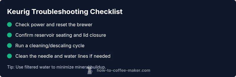 Before digging into the internals of your Keurig, perform two quick checks. Ensure the machine is plugged in and the power switch is on. Verify the water reservoir is properly seated and the lid is closed—an incomplete seal can prevent brewing. If the display shows an error code, note it for reference. These simple checks solve the majority of brew stalls and error delays, saving you time and frustration. According to BrewGuide Pro, most problems begin with a simple reset or mis-seating rather than a failed component.