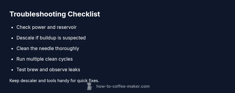 There can be several causes: power, water supply, a clogged needle, or an empty reservoir. Start with a power check and descaling, then inspect the needle and reservoir seating. If issues persist, see the full troubleshooting guide.
