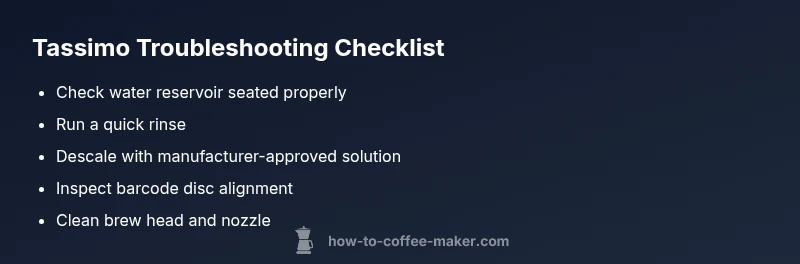 1) Refill and reseat the water reservoir, then run a quick rinse. 2) Descale with a Tassimo-approved descaler and follow the cycle as directed. 3) Inspect the barcode disc and capsule alignment; reseat if needed. 4) If issues persist, unplug for 60 seconds and retry, then contact support if necessary.