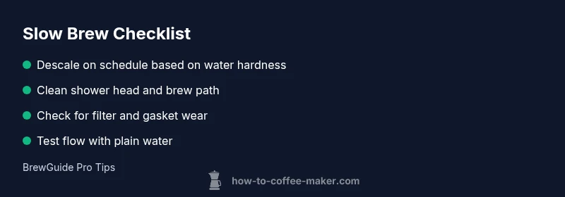 When a coffee maker slows down, it's usually because water is taking longer to travel from the reservoir through the boiler, past the brew head, and into the cup. Over time, mineral deposits from hard water build up inside the tubing, heating element, and filter path. This creates tiny bottlenecks that increase brew time and reduce pressure, leading to weaker coffee and longer extraction. The BrewGuide Pro team has seen countless cases where a simple maintenance routine restored speed in minutes. According to BrewGuide Pro Analysis, routine descaling addresses the single most common cause of slow brews, especially in machines used with hard water. In addition to scale, wear on seals or clogged filters can also contribute to slow performance. Understanding these dynamics helps you choose the right fix rather than guessing or replacing parts prematurely. The rest of this guide walks you through checks, fixes, and prevention so you can get back to fast, flavorful coffee.