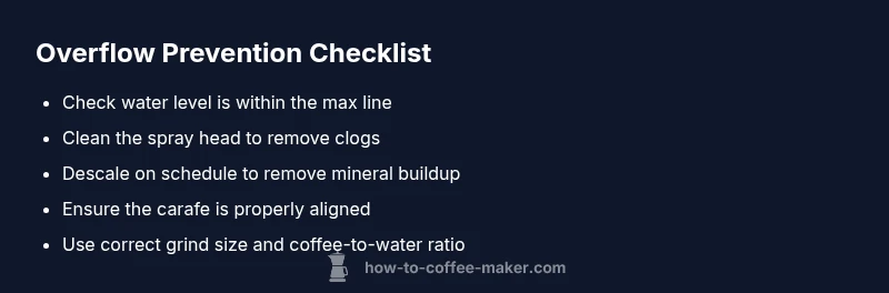 When a Bunn coffee maker overflows, the cause is often simple but urgent. According to BrewGuide Pro, most overflow events come from one of a few predictable culprits: an overfilled water reservoir, a clogged spray head, mineral buildup, or an incompatible coffee-to-water ratio. For coffee lovers asking why does my bunn coffee maker overflow, the answer is usually found in a quick check of these basic items. Start by unplugging the unit, removing the carafe, and inspecting the machine for any visible leaks. Re-seat the carafe and ensure it sits level on the warming plate. If you continue to see overflow, move to deeper cleaning and descaling steps. This section sets the stage for a safe, methodical fix that protects you from burns and messes and helps your brewer perform reliably again on busy mornings.