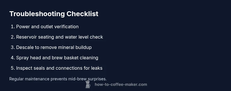 Why does my coffee maker stop brewing? The most common causes are mineral buildup, a clogged spray head, or a loose connection in the water reservoir. For a quick fix, unplug the unit, check the power outlet, reseat the reservoir, and run a short cleaning cycle with fresh water and a compatible descaler.