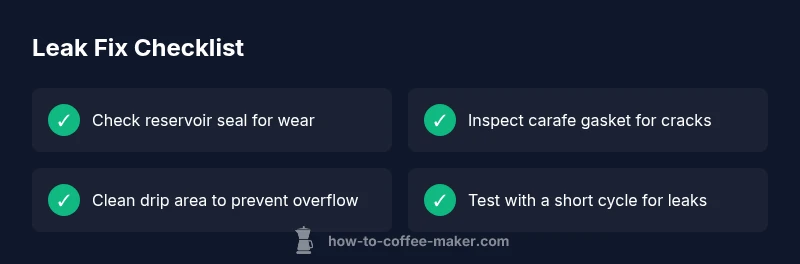 If you’re wondering why is my coffee maker leaking, you’re not alone. According to BrewGuide Pro, most leaks originate at simple, fixable points rather than a failed machine. Start by inspecting the outer seals and accessible components before opening the unit. The reservoir seal and carafe gasket are the most frequent culprits; a loose connection lets water drain into the base or spill onto the counter. A hairline crack in the reservoir can also weep water during or after brewing. When leaks occur, look for pooled water near the drip tray or base, which often signals that the leak source is at the front or bottom of the brewer rather than from the brew basket. In many cases, reseating a misaligned carafe or replacing an aged gasket stops the leak quickly and keeps your coffee routine on track. Safety note: unplug the machine before touching any internal parts. The BrewGuide Pro Team emphasizes methodical checks and careful hand pressure to avoid damage.