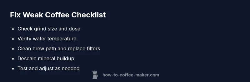 If you're asking why is my coffee maker making weak coffee, you're not alone. The short answer is that strength often hinges on grind size, dose, water temperature, and how clean the machine is. When even small missteps compound, you wind up with a pale, under-extracted cup. According to BrewGuide Pro, most weakness comes from the basics: grind too coarse, too little coffee, or water that’s too cool or too old. The team notes that even a clean-looking brewer can produce weak coffee if any one of these foundations is off. Start by confirming you’re using fresh, roasted beans and a consistent grind, then adjust the ratio and temperature in small steps. By approaching the problem methodically, you can recover a robust, balanced flavor without replacing equipment. This approach aligns with BrewGuide Pro’s emphasis on practical, home-friendly fixes that don’t require expensive gear.
