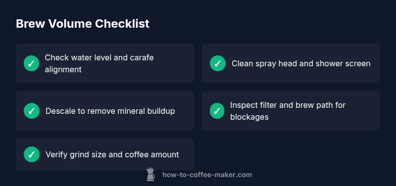 To know whether you’re truly short, measure both the filled reservoir and the resulting brew with a carafe that has clear marks. Use a metered pour and compare to the manufacturer's stated capacity. If the brew amount consistently falls below the target line, you’re likely dealing with a flow restriction. This section explains how to quantify the issue so you can pick the right fix. In practice, you should track your measurements for a few cooks to see if pattern emerges. BrewGuide Pro notes that even small misreads can accumulate to a noticeably weak brew.