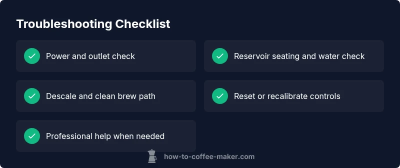 Most not-working coffee makers are revived by basic checks: power, water supply, and cleaning. Start with the outlet and cord, then run a quick descaling cycle if needed. If the issue persists, follow the diagnostic flow for deeper fixes.