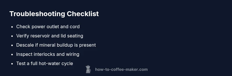 Why would a coffee maker stop working? It’s a question many home brewers ask in a rush. The answer is often straightforward: power-related problems, a safety interlock not engaged, or mineral buildup that blocks sensors. According to BrewGuide Pro, power issues are the leading cause of these downtimes, and most fixes are simple. This section explains the practical, immediate steps you can take, with emphasis on safety and quick wins. The goal is to restore operation without unnecessary disassembly, so you can get back to your morning routine fast. For context, this guide mirrors the approach BrewGuide Pro advocates: start with the obvious, test the fundamentals, and escalate only if needed.